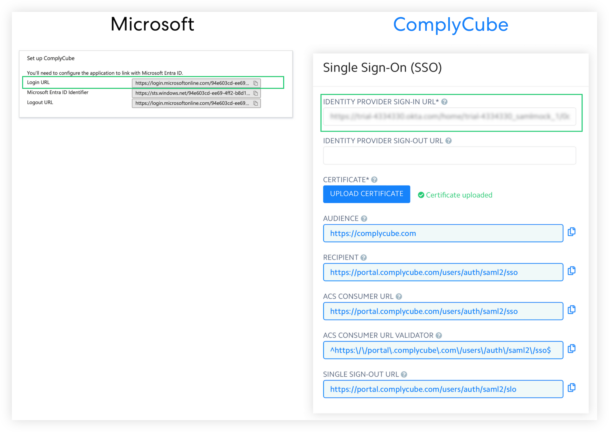 Now you can go to your ComplyCube SSO settings page, update the Sign-In URL, and upload your Signing Certificate (i.e., X.509 certificate).