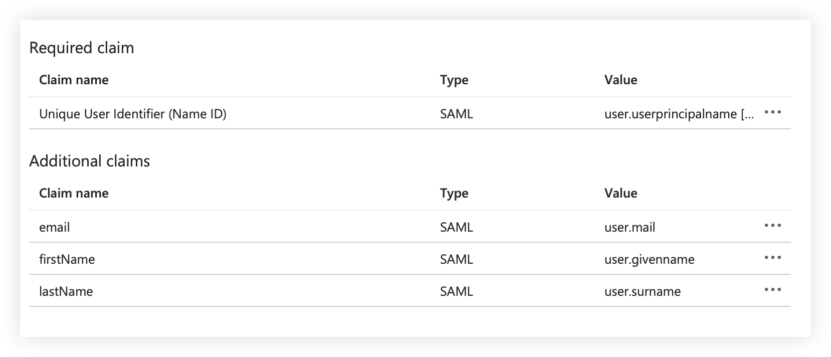 The next step is to configure your Attributes & Claims settings. As shown in the image below, please ensure the following Attribute Statements are mapped in Microsoft Entra ID - 'firstName', 'lastName', and 'email', as they will be used to update the user profile details in ComplyCube, on every login.