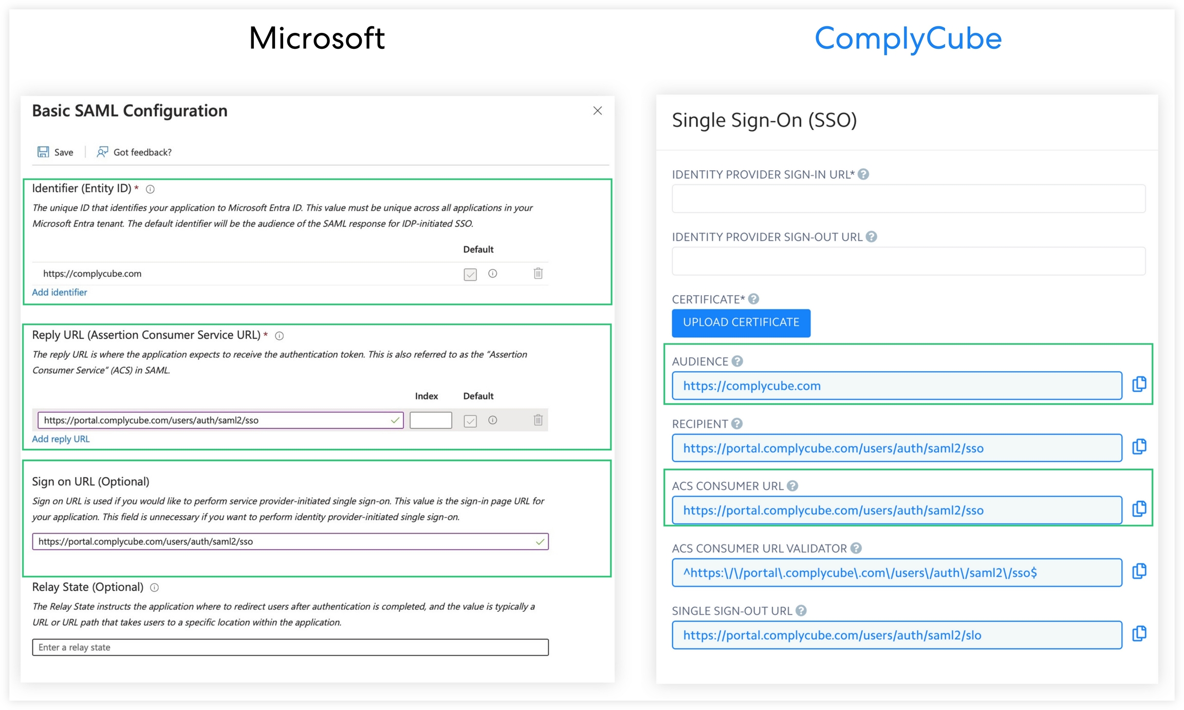 Reply URL (Assertion Consumer Service URL): The location where Microsoft Entra ID sends SAML responses. Use the ACS Consumer URL from ComplyCube.