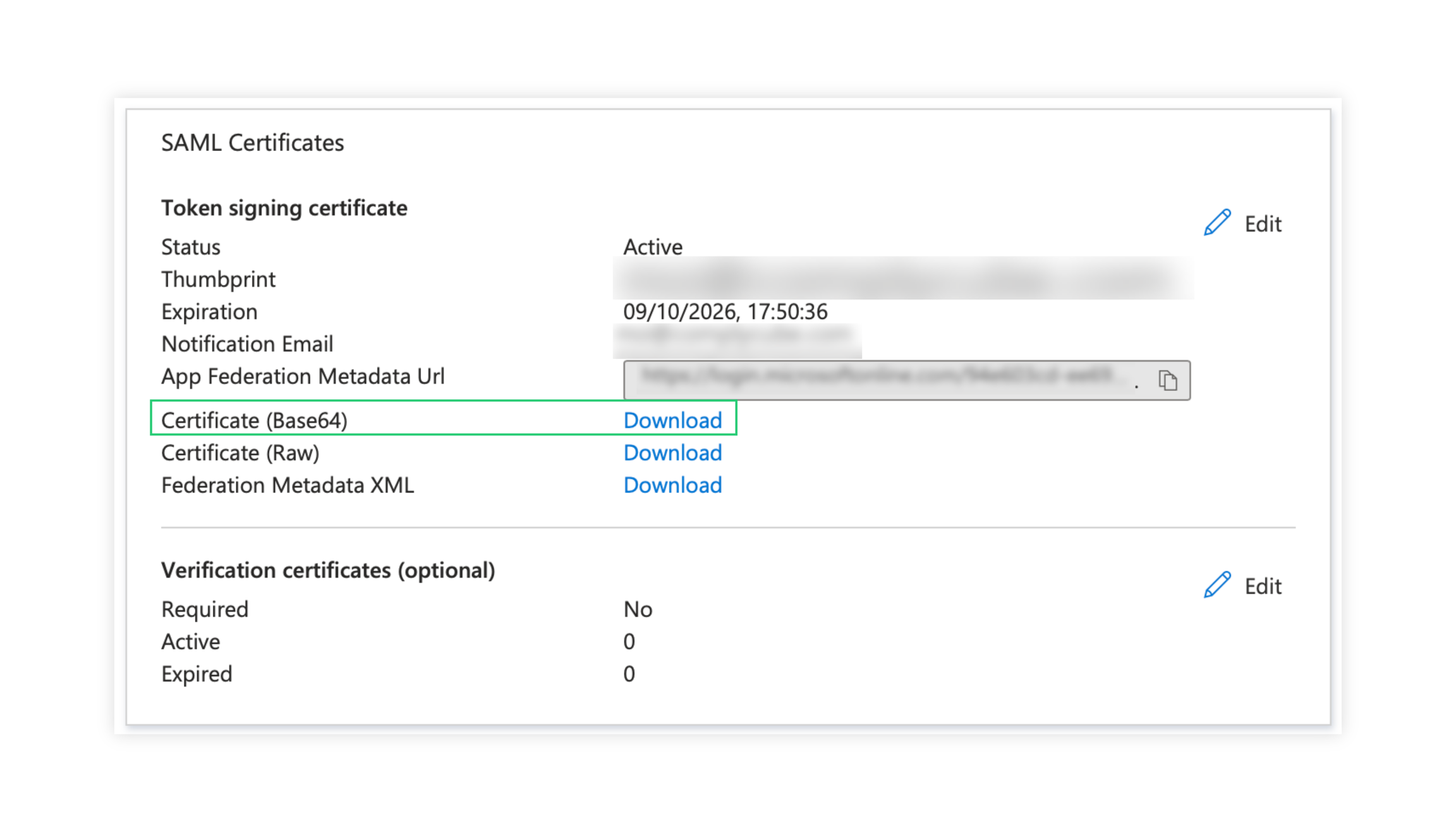 Click Edit on SAML Certificate and download the Certificate (Base64).