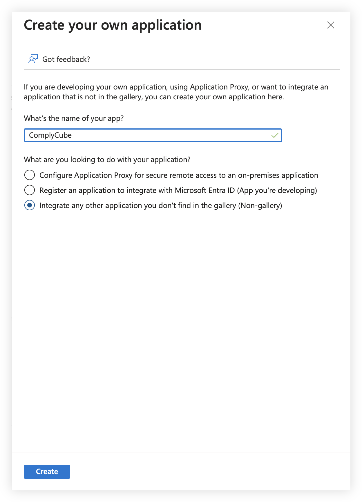 Select Create your own application, name your application "ComplyCube", select the Non-gallery option, and click Create.