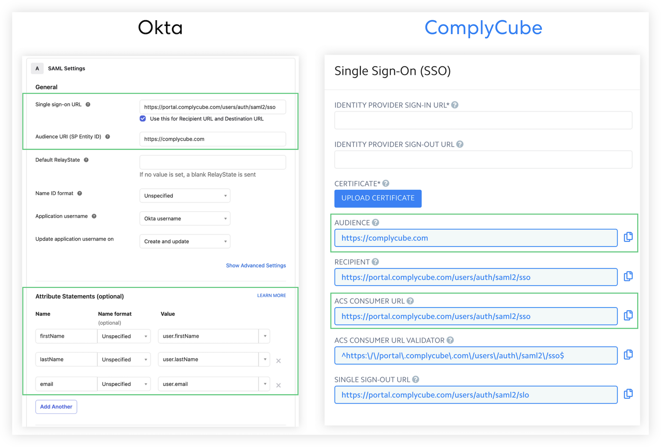 Also, as shown in the image below, please ensure the following Attribute Statements are mapped in Okta - 'firstName', 'lastName', and 'email', as they will be used to update the user profile details in ComplyCube, on every login.