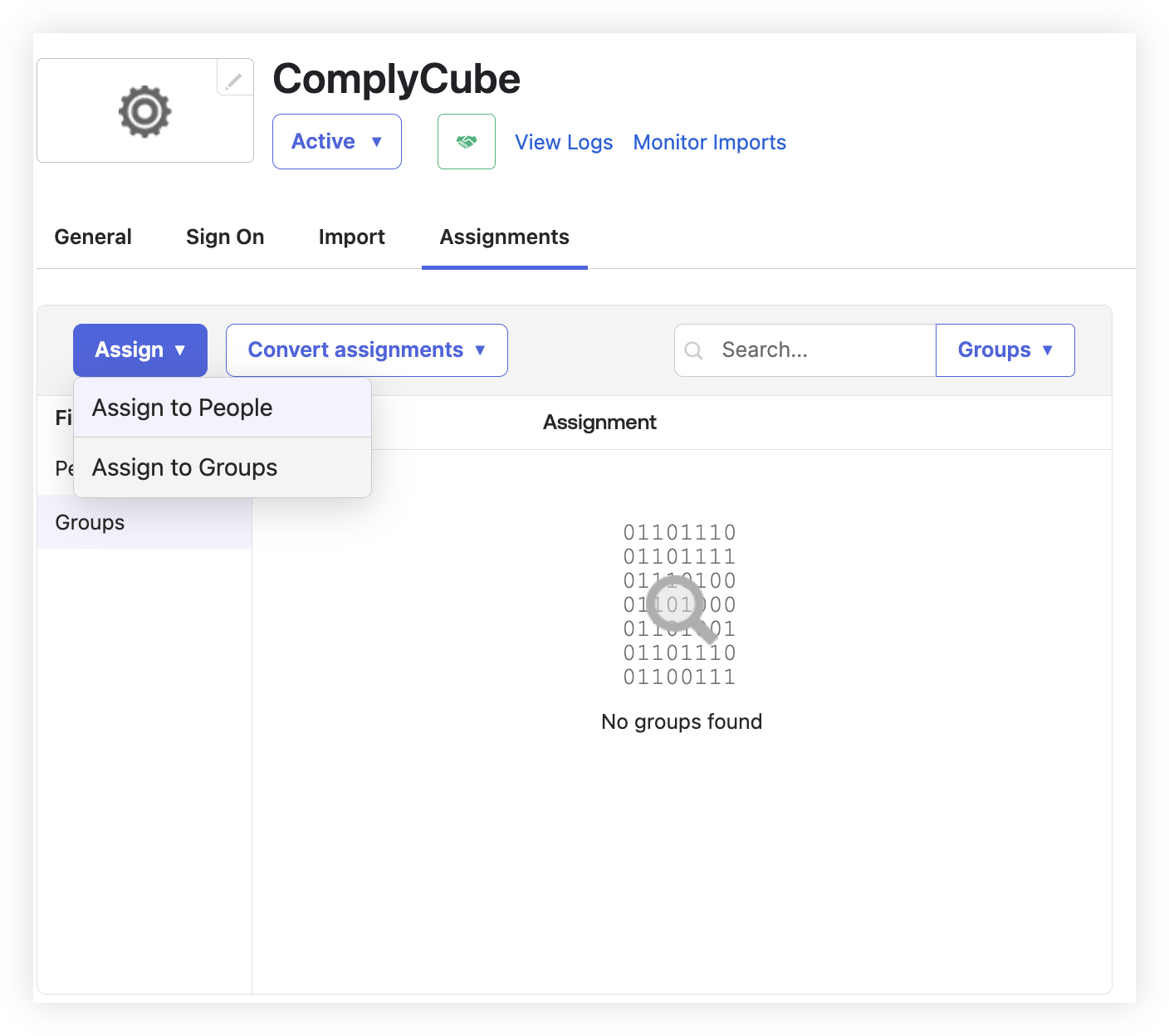 Now, navigate to the application, Applications -> ComplyCube, click on Assignments, and assign your group.