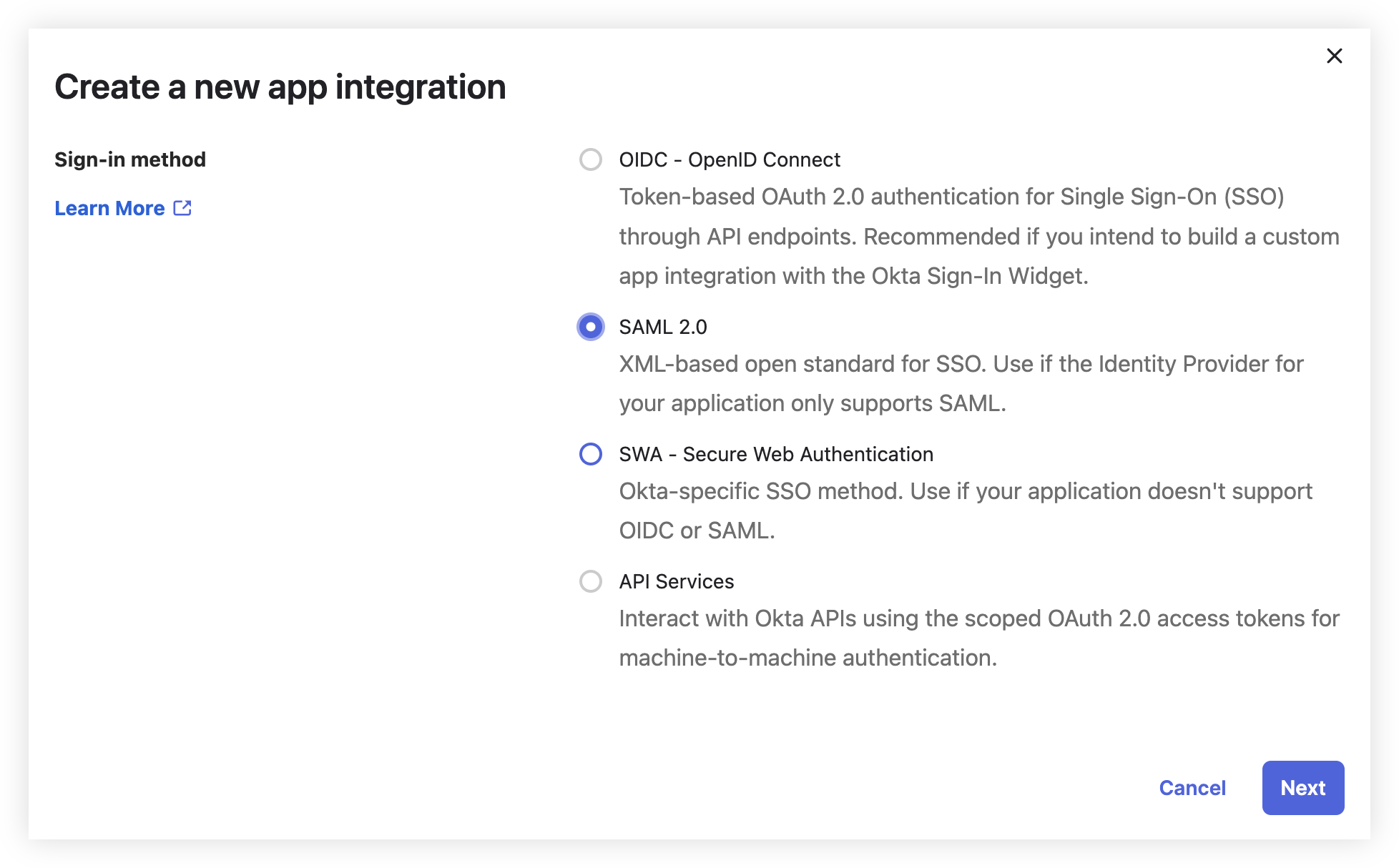Select SAML 2.0 as the sign-in method.